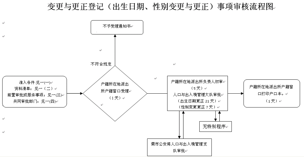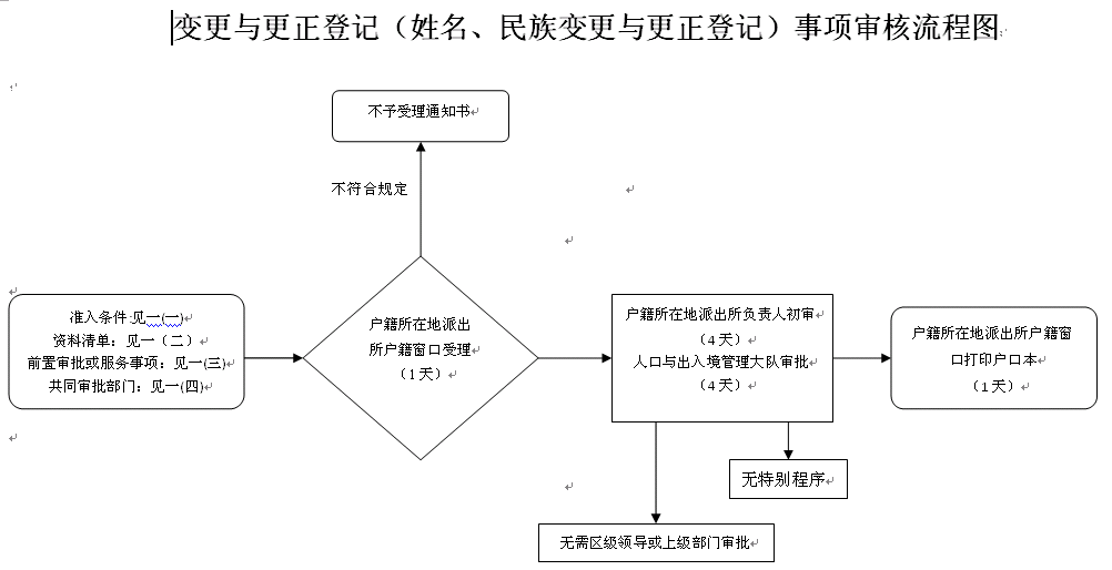 时限:姓名、民族成分变更、更正登记,自受理之日起10天内完成;出生日期更正登记自受理之日起30天内完成;性别变更登记,自受理之日起15天内完成;其它辅项变更和更正登记,手续齐全的,当场办结。